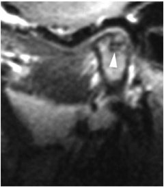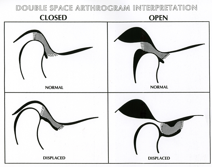 In the past, arthrography and arthrotomography, contrast-enhanced imaging, have been considered the methods of choice for imaging TMJ internal derangement. Contrast media is injected into one or both joint spaces under fluoroscopic guidance. The intra-articular tissues (disc and retrodiscal tissues) are then “silhouetted” by the contrast material, allowing visualization of the disc profile, as well as real-time movement of the condyle with respect to the disc within the joint. This is the major advantage of this technique. It can also demonstrate perforations of the tissues that are recognized under fluoroscopic observation when injection of contrast into one space then flows into the other. It also allows visualization of disc adhesions. Its limitation is that it does not allow interpretation of sideways or rotational displacements of the disc.