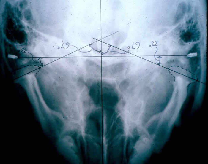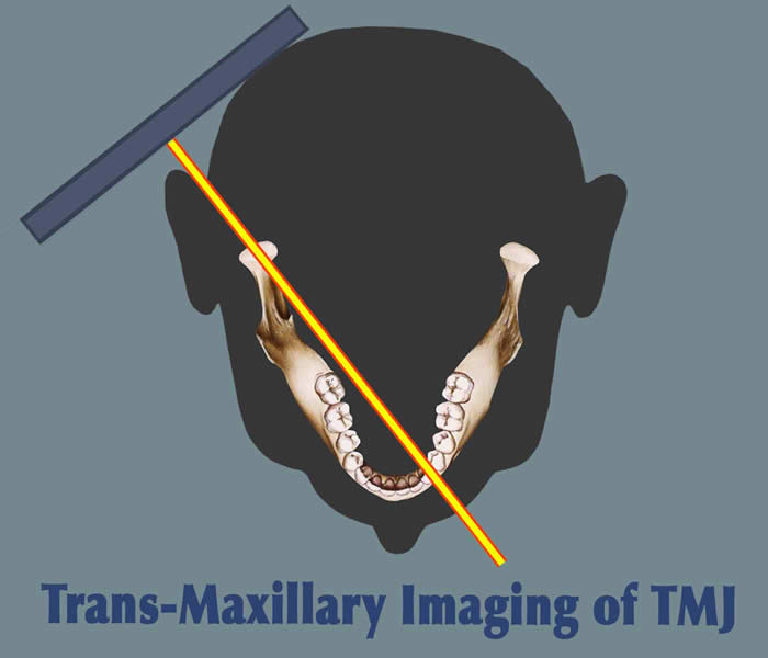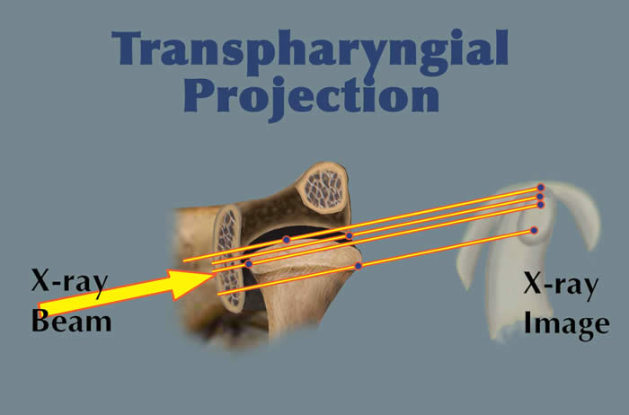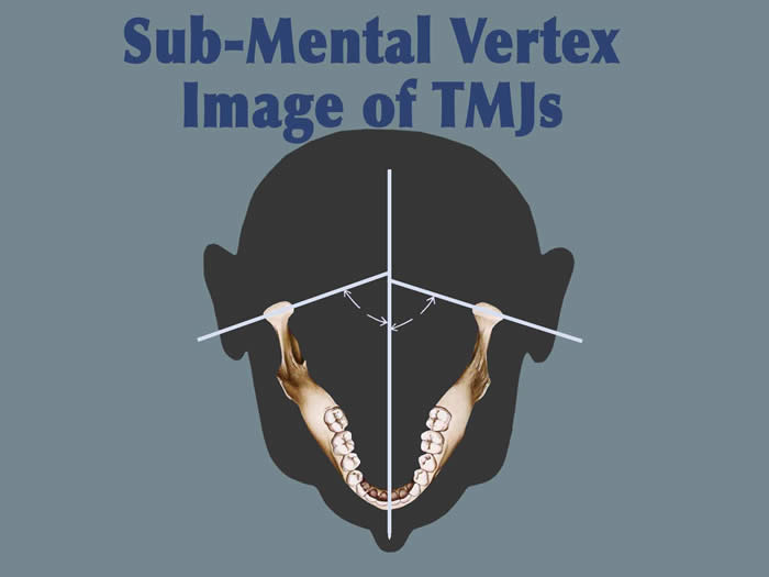 This projection allows measuring the angle of the condyles to the mid-sagittal plane. It is often used as a scout film prior to taking corrected tomograms, thus permitting accurate sectioning of the condyles perpendicular to their individual long axes.