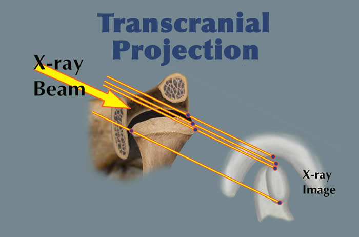The transcranial view does not project a true sagittal image of the condyle, fossa, or joint space. Because of the distortion that results from the angle of the x-ray beam to these joint structures, this projection has largely been abandoned in favor of more accurate and revealing projections. Historically, one of the advantages of the transcranial projections has been that it could be taken in the dental office.