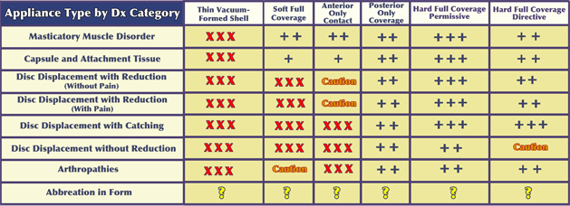 The following table of recommendations for Appliance Type by Diagnostic Category is based upon the clinical experience of Drs. Higdon and Howard.
